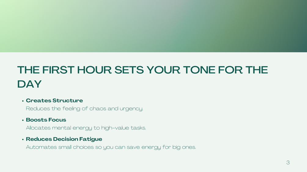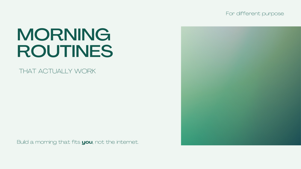 A practical and beautiful presentation showing how to build a morning routine that actually fits your life — no 5AM hype, just calm, structure, and focus. Perfect for students, freelancers, and creators who want mornings that feel good, not forced.